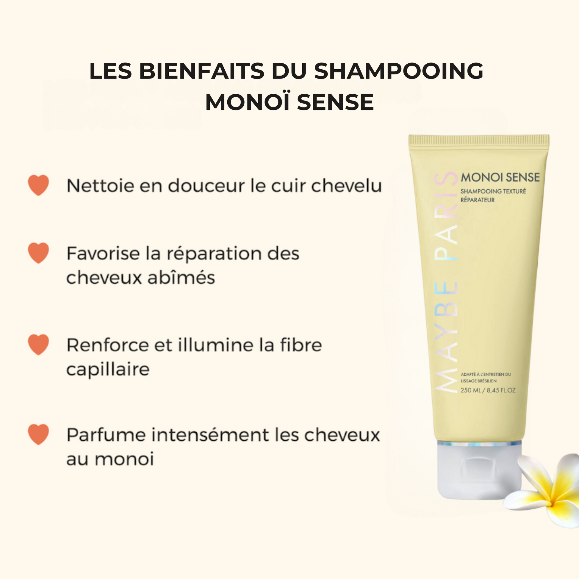 Le shampooing MONOI SENSE répare les cheveux abîmés grâce à sa formule enrichie en protéines végétales. Il reconstruit, renforce et illumine la fibre capillaire.