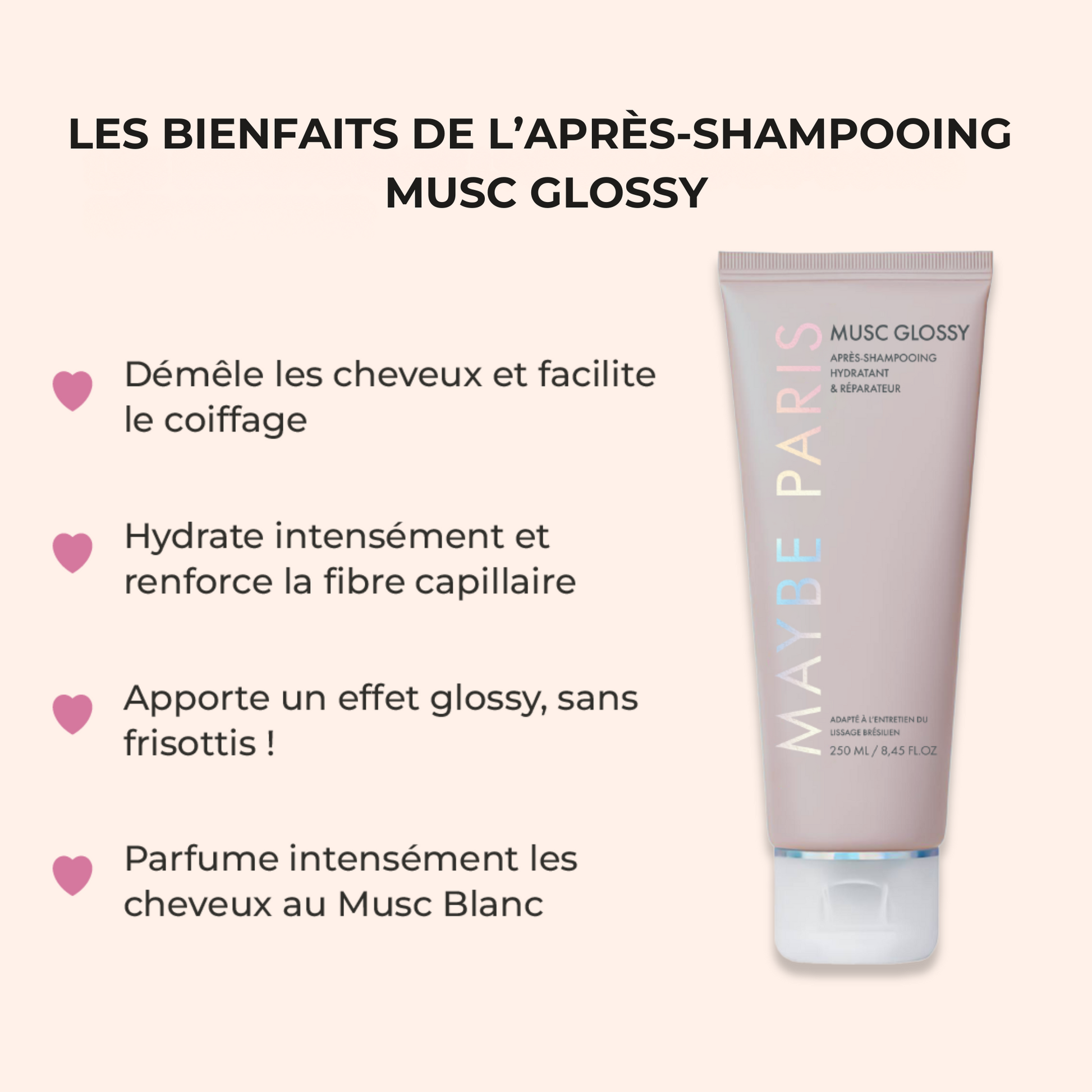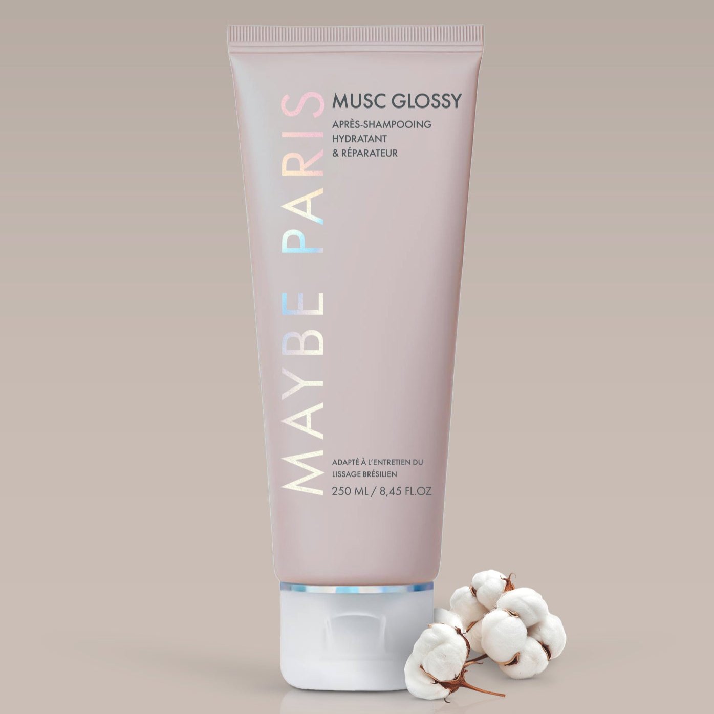 L'après-shampooing MUSC GLOSSY répare les cheveux abîmés. Enrichi en protéines végétales, il reconstruit, renforce et illumine pour des cheveux propres et régénérés.