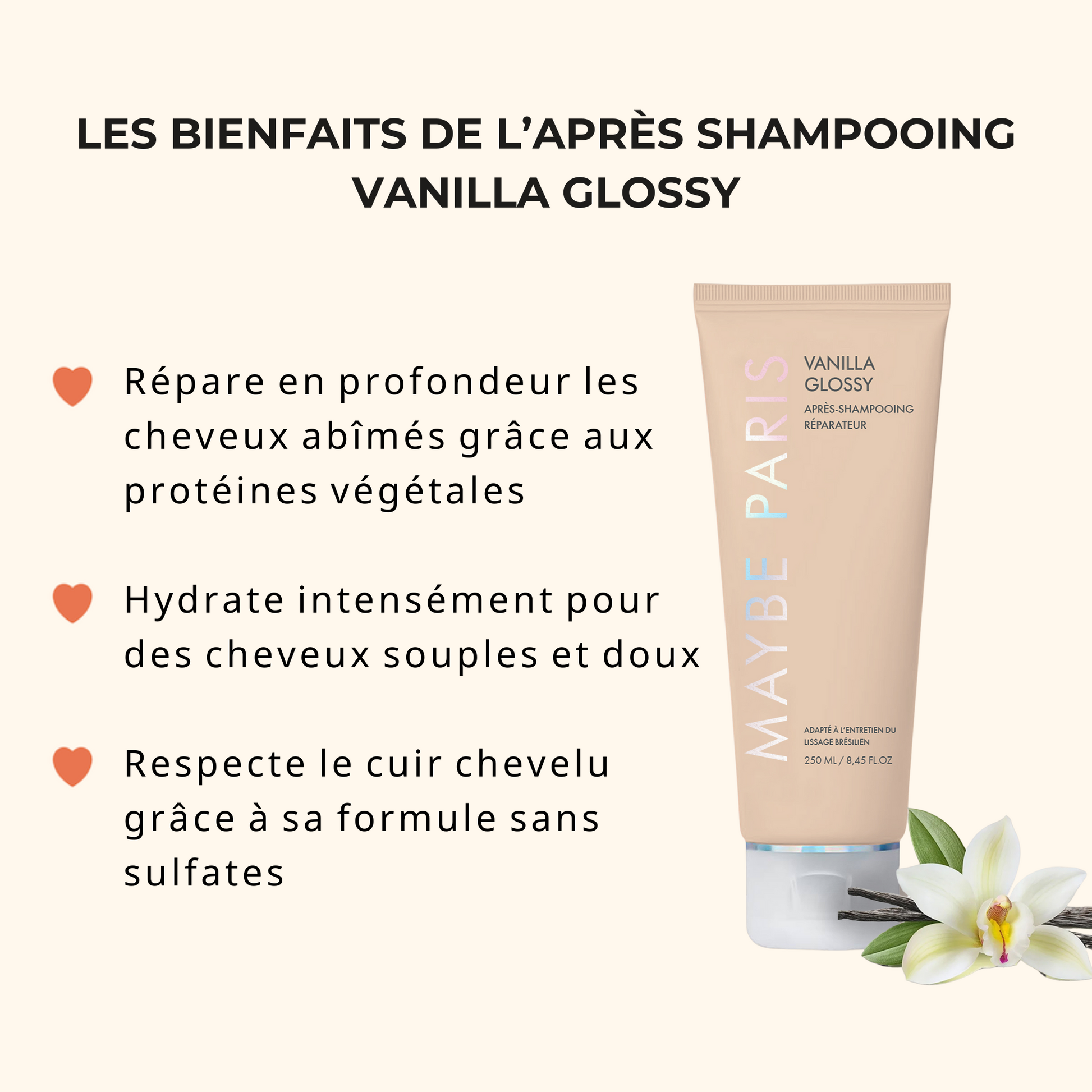 L'après-shampooing VANILLA GLOSSY répare les cheveux abîmés. Enrichi en protéines végétales, il reconstruitrenforce et illumine pour des cheveux propres et régénérés.