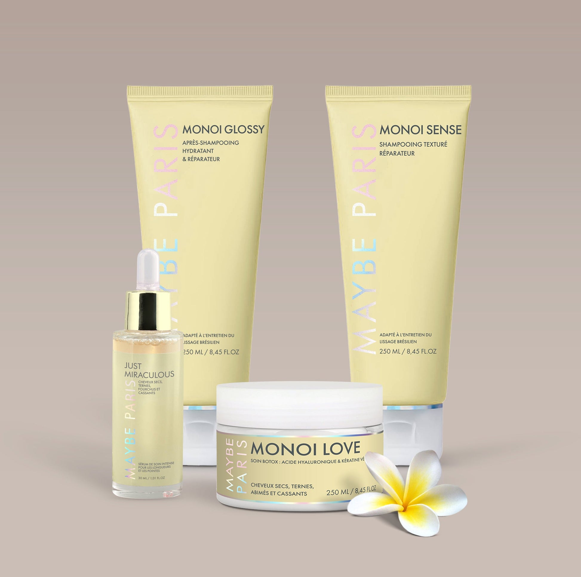 - Shampooing MONOI SENSE, Après-Shampooing MONOI GLOSSY, Soin MONOI LOVE, Sérum JUST MIRACULOUS