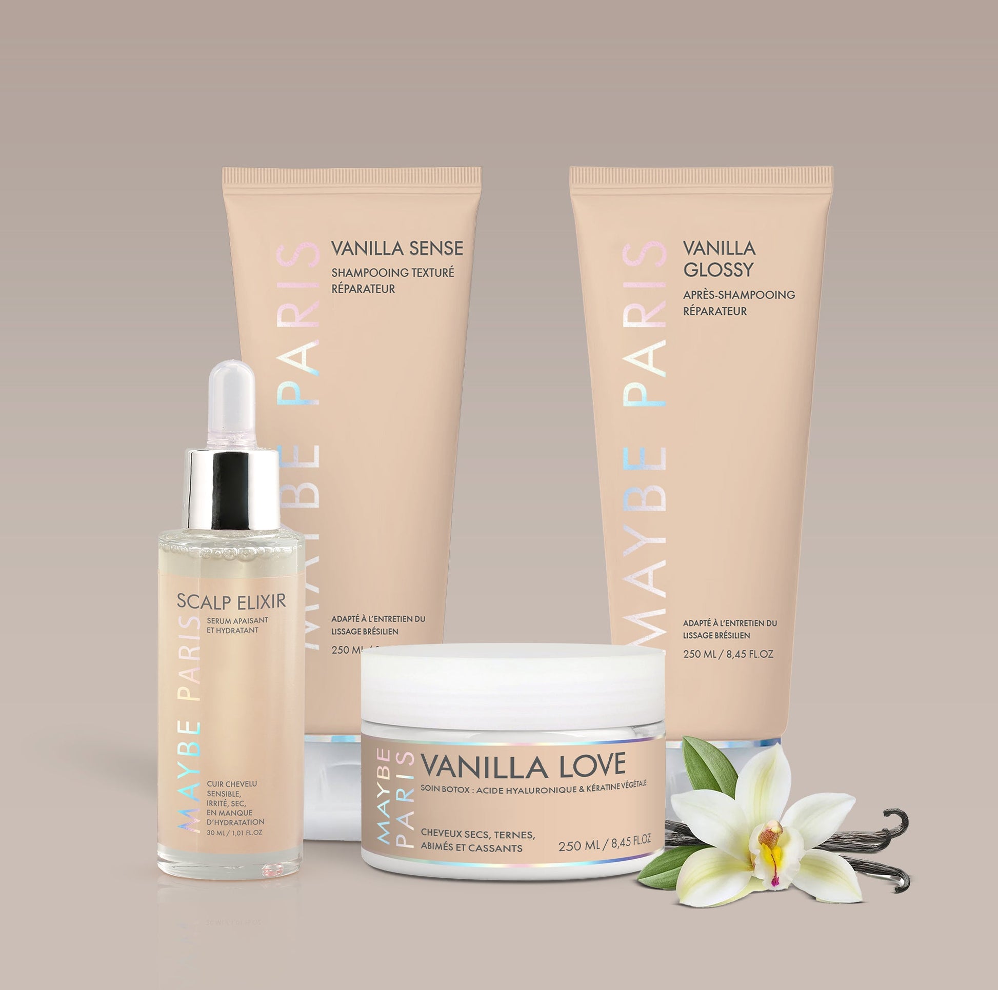 - Shampooing VANILLA SENSE, Après-Shampooing VANILLA GLOSSY, Soin VANILLA LOVE, Sérum SCALP ELIXIR