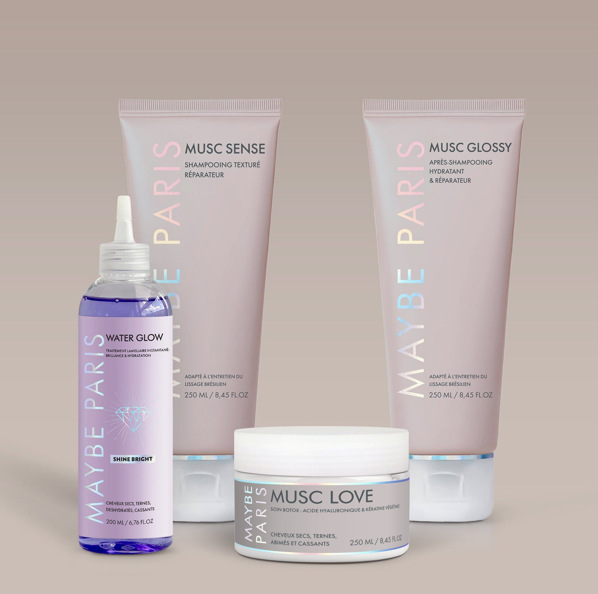- Shampooing MUSC SENSE, Après-Shampooing MUSC GLOSSY, Soin MUSC LOVE, Eau Lamellaire WATERGLOW