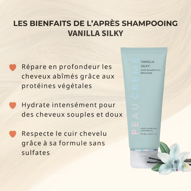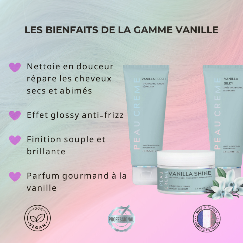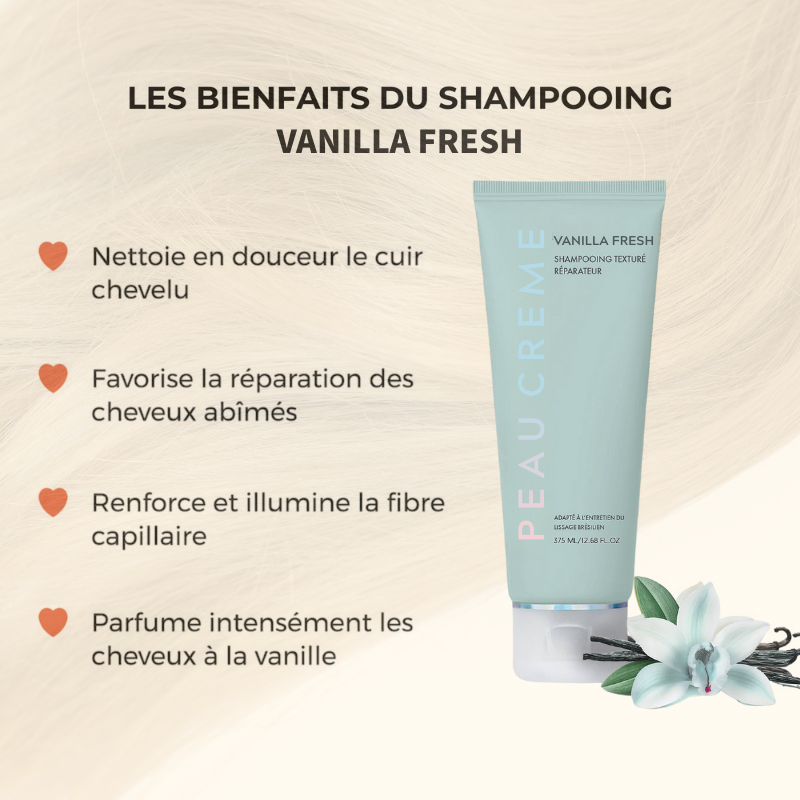 Le shampooing VANILLA FRESH répare les cheveux abîmés grâce à sa formule enrichie en protéines végétales. Il reconstruit, renforce et illumine la fibre capillaire.